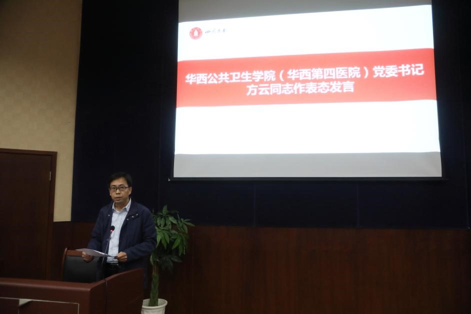 华西公共卫生学院(华西第四医院)党委书记方云同志代表院党委作表态发言。他表示,将提高政治站位,充分认识到巡察工作的重要性,切实把思想和行动统一到学校党委的巡察工作部署上来。全院师生职工将主动支持配合巡察,严格按照巡察组要求,实事求是地向巡察组提供情况、反映问题,客观公正地提出意见和看法,确保巡察组了解真实情况、发现实际问题。学院(医院)将以接受巡察为契机,对照上级和学校党委的各项规定和要求,找准问题短板,强化落实整改,努力推动学院(医院)各项工作迈上新台阶、实现新跨越。