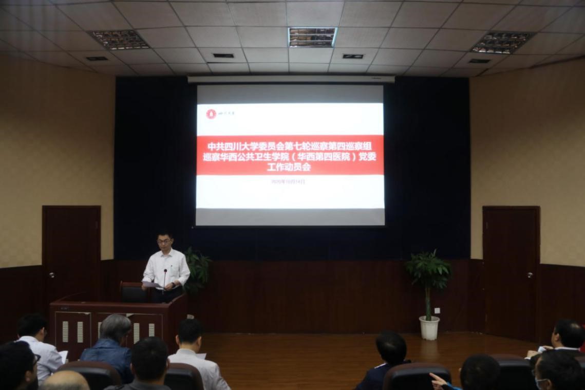 根据学校第七轮巡察工作统一部署,10月14日下午,中共9428cn太阳集团古天乐委员会第七轮巡察第四巡察组巡察华西公共卫生学院(华西第四医院)党委工作动员会在华西校区卫生管理干部培训中心阶梯教室举行。学校第七轮巡察第四巡察组全体成员,院领导、工会主席、两委委员、国字号人才、党支部书记、院内中层干部、离退休代表、学生代表等参加了动员会。会议由华西公共卫生学院(华西第四医院)院长张本同志主持。