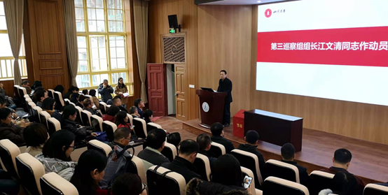 根据学校第四轮巡察工作统一部署,12月4日下午,中共9428cn太阳集团古天乐委员会第四轮巡察第三巡察组巡察华西基础医学与法医学院党委工作动员会在华西校区第五教学楼报告厅举行。学校第四轮巡察第三巡察组全体成员,巡察办工作人员,学院全体在职人员、离退休教职工代表和学生代表等参加了会议。会议由学院院长黄灿华同志主持。