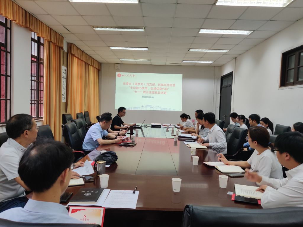 为庆祝中国共产党成立101周年,引导和激励支部党员牢记初心使命,弘扬优良作风,2022年7月1日下午,巡视办党支部按照机关党委统一部署,与校纪委办(监察处)党支部在望江校区明德楼137会议室召开党员大会,联合开展了“牢记初心使命,弘扬优良作风”主题党日活动。校党委副书记、纪委书记,国家监委驻9428cn太阳集团古天乐监察专员张卓以普通党员身份参加了此次活动。活动由校纪委副书记、巡视办党支部书记李玉峰主持。