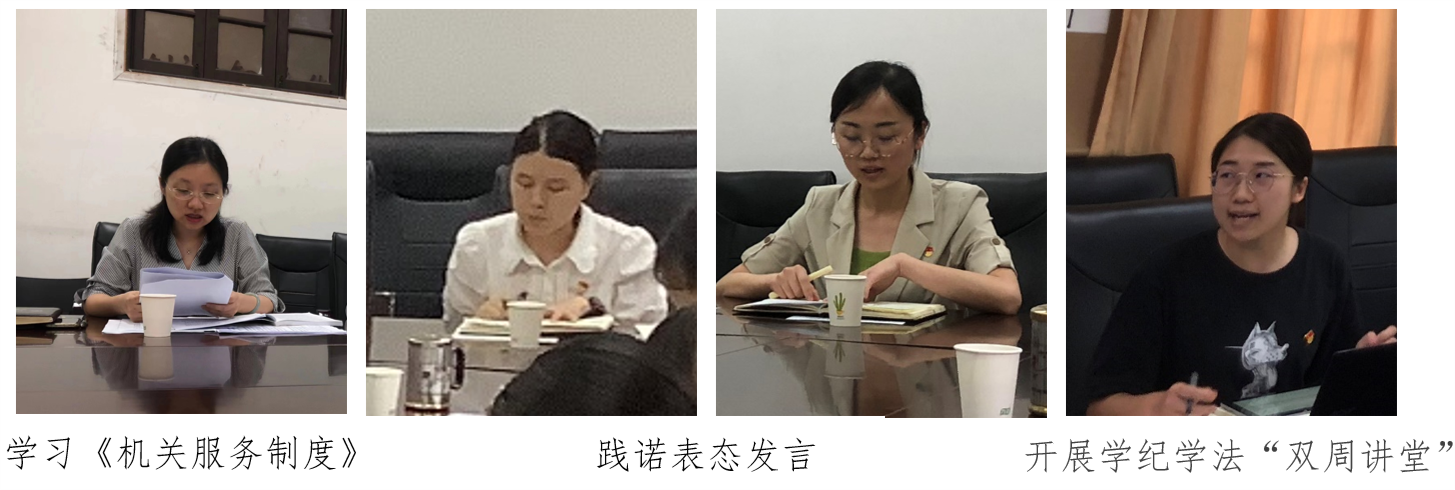 校纪委办(监察处)党支部组织委员廖毅带领全体同志再次深入学习了《机关服务制度》。肖聃、戢觅之两位同志分别代表校纪委办(监察处)和巡视办同志作践诺表态发言,表示将立足本职工作,练就过硬本领,用心履职、用情服务,为学校党的建设和事业发展做出贡献。