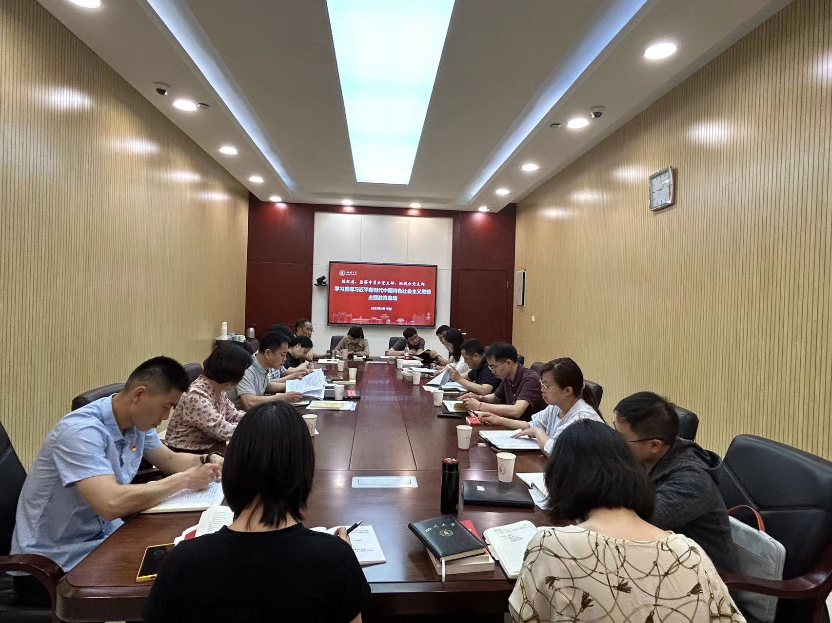2023年4月19日上午,学校纪委、监察专员办党支部联合党委巡视工作办公室党支部在望江校区明德楼二楼二会议室召开学习贯彻习近平新时代中国特色社会主义思想主题教育动员会。学校纪委副书记、党委巡视工作办公室党支部书记李玉峰主持会议。学校机关党委第一指导组成员马涛、覃世扬到会指导。